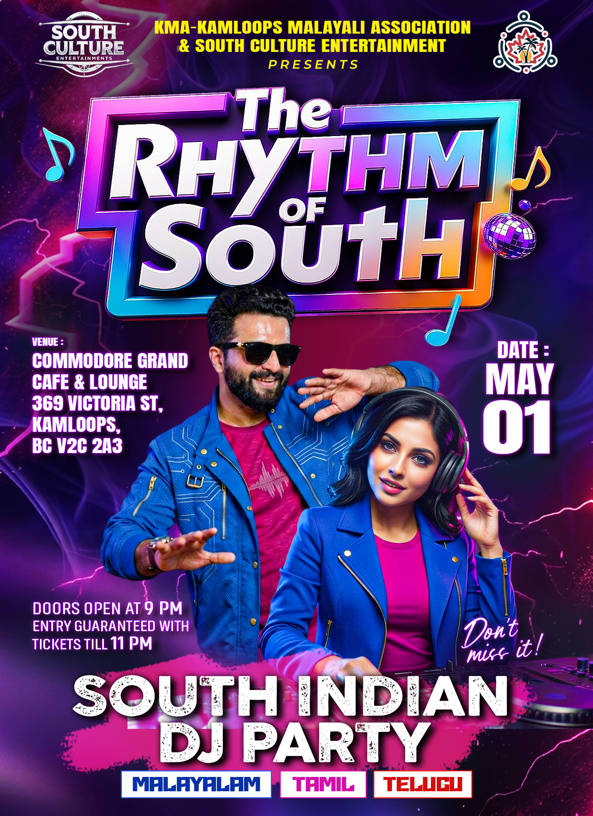After the big success of Rhythem of South, we are back again with… A Grand South Indian DJ Night featuring an LED dance floor, glow lights, and nonstop south beats!